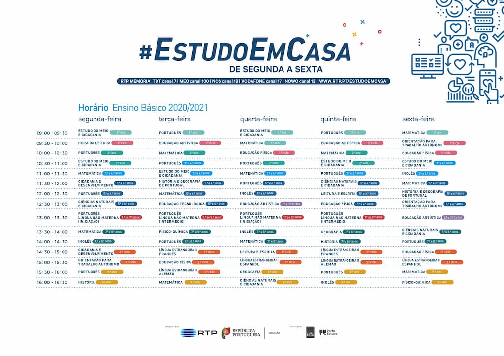 Apresentamos os horários e os links, estudoemcasa.dge e RTP Play para aceder.